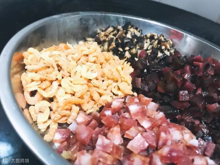 3、材料备好之后,下一步就是“炒料”。将腊肉、腊肠以及虾米分别放入锅内炒煮,加入适量的酱油、盐、糖。在炒白萝卜丝时,先将白萝卜水挤干,将萝卜水存在大碗中。炒白萝卜时加入盐去涩味,还可以给上两勺胡椒,起到驱寒的功效。