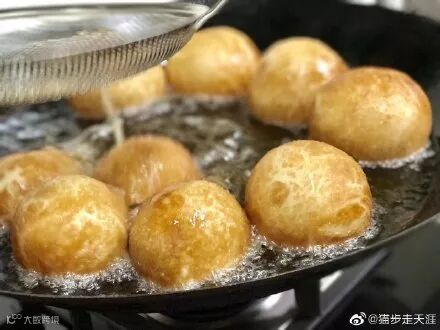 3、热锅落油,烧至120℃时,将煎堆坯轻轻放进热油中,边炸边用长筷子翻动,使之均匀受热,炸至体积比原坯大一倍时捞起,待完全冷却后再用同样方法炸一遍,如此反复3~4次,使之膨胀至排球般大小即成。