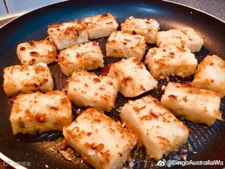 6、在大钵中涂上少量油,将搅拌完的萝卜糕材料放到钵中铺平,猛火蒸40-45分钟。想要煎糕的街坊可将萝卜糕放到冰箱一个晚上,待糕凉透后再煎。