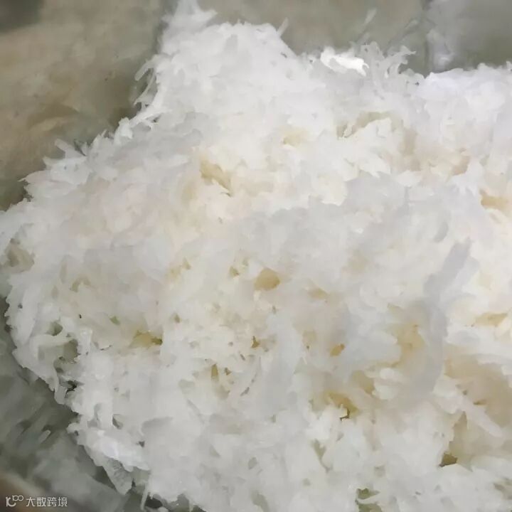 1、取100克糯米粉用清水调拌,搓成粉团,放沸水锅里煮熟,捞出放在案板上,混入余下的400克糕米粉并加入白糖,拌匀后用手掌反复搓至有韧性和粘性(如太干硬,可加进少许热水再搓),即成糯米粉团。