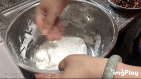 4、将粘米粉放到存有萝卜水的大碗中,配合按压以及搓的动作,将粘米粉做成粉团状。