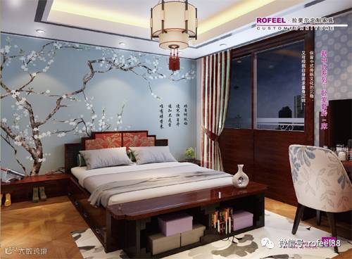 淡雅风格的整体布局,使整体空间感觉更加丰富,以梅花图作为床头背景墙,无形中凸显卧室有典雅之势。