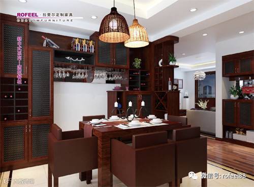 设计融合一体,造型大方、气派、别致,酒柜上的小盆景点亮整个餐厅,让整个用餐环境显得典雅宁静。