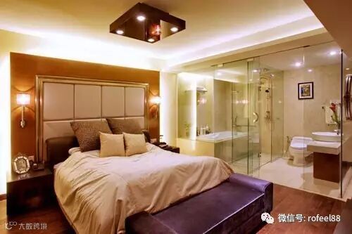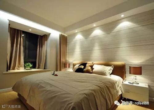 卧室的照明要求不多,但需要注意的是,卧室不宜采用向下射的灯具,宜用照顶的灯光。