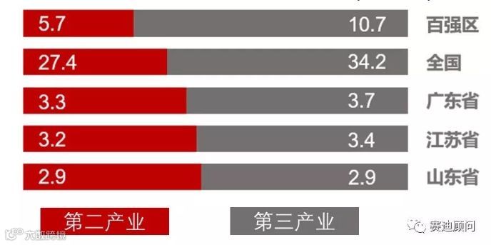 从产业来看,多数百强区第一产业已经完全腾退,第二、第三产业所占总比重超过99%,总体上已位于城市工业化的后期。第三产业发展势头强劲,百强区三产比重达到65.2%,高于全国平均水平13个百分点,消费和服务带动的第三产业已成为拉动城区经济发展的主要力量。
