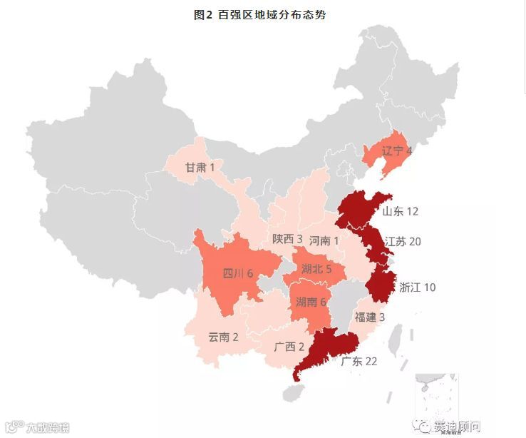 从区域分布来看,东部地区占67席并且包揽百强榜前20名,中部地区占14席、西部地区占15席,东北地区占4席。