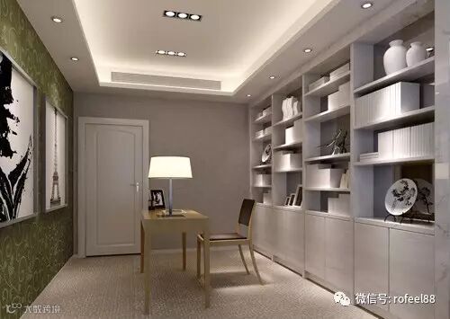 书房中最好要有台灯和书柜用射灯,以便于主人阅读和查找书籍,灯光以单纯些为好,在保证照明度为前提下,可配乳白或淡黄色的壁灯与吸顶灯,光线要均匀地照射在读书写字的地方,不宜离人太近,以免强光刺眼。