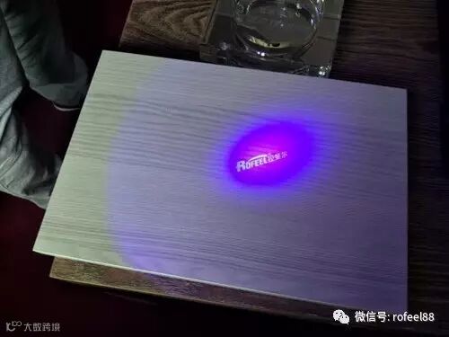 拉斐尔板材贴面带有“ROFEEL 拉斐尔”,在紫外灯下显防伪荧光,消费者可用紫外灯照射板材表面识别是否拉斐尔正品。