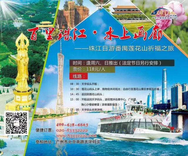 清明4月2-4日,天字码头加推珠江日游莲花山线路,推广价118元/人。