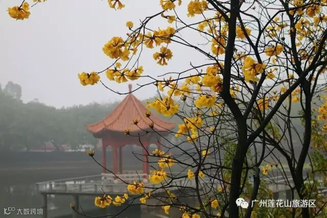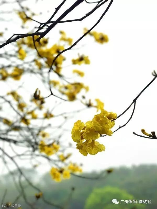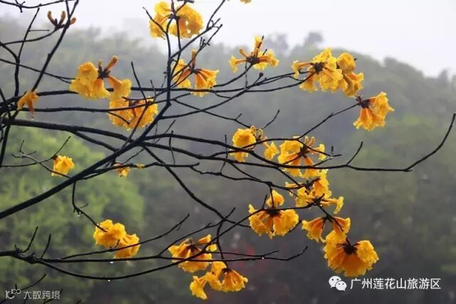 三月的莲花山,黄花风铃木来得突然,披上了明亮的黄色舞衣上场,轻舞飞扬。适逢近期阴雨绵绵,成片的黄花为这阴沉的天增添了一抹亮丽春色。
