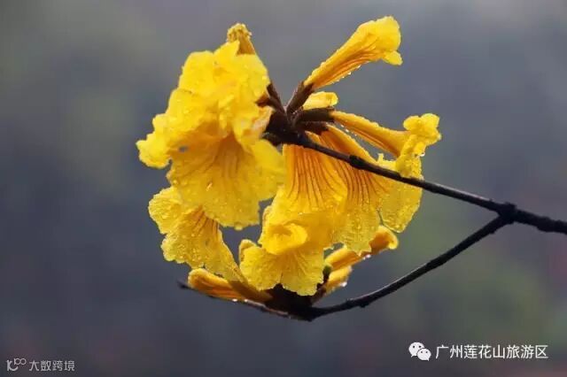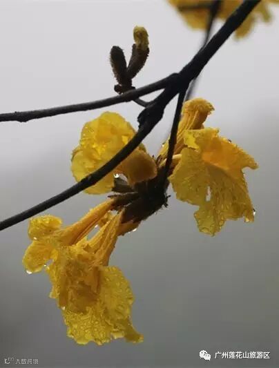 黄花风铃木又称黄金风铃木,是巴西国花;树上每朵花的花冠都呈漏斗形,状似风铃,花色纯黄,没有一点杂质,三五朵花聚成一簇簇花球,好似在光秃秃的树枝上挂上串串风铃,迎风摇摆,给阴天点缀上了靓丽的色彩。