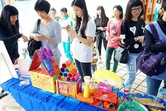 现场摊位还有漂亮的大姐姐在耐心为各位讲解小朋友的环保作品