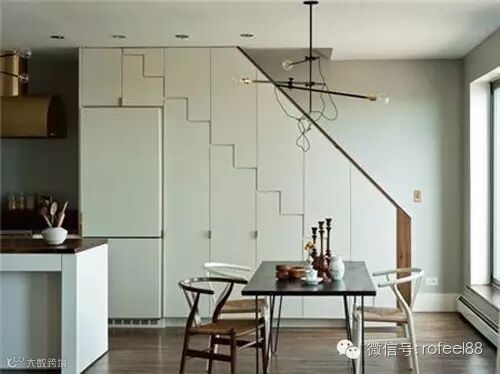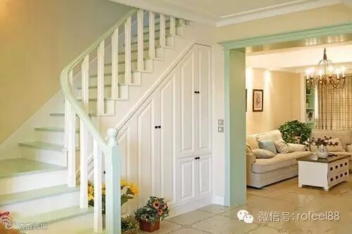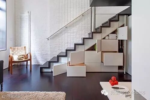楼梯下面也可以增加抽屉来增加收纳空间,墙上也可以增加收纳空间。