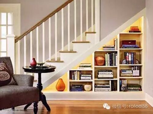 利用楼梯下面空间,做个收纳书架,下方有抽屉对开门,可以隐藏许多杂物。