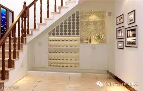 喜欢喝酒、品酒、藏酒的朋友最适合这类收纳法了,将楼梯下方空间做成一个置酒柜,旁边还能放置一些艺术品,主人的高逼格立显,品格也提升了不少。