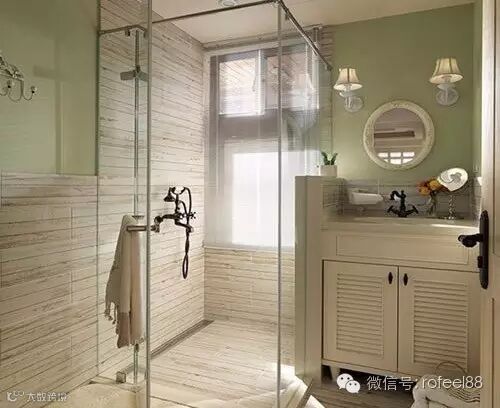 浅色木纹砖与草绿色墙面的色系搭配,营造清爽舒适的沐浴空间。