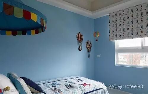 蓝色调的木地板男孩房中,在墙上贴饰热气球壁饰,营造漂浮在蓝天上作梦的男孩风梦幻。