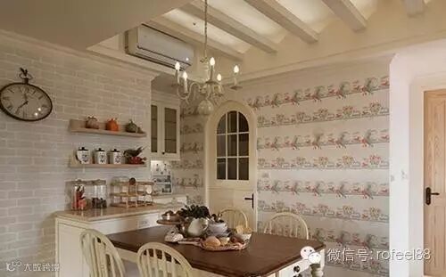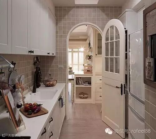 圆拱线条的上下双开门内,透过復古砖与白色木作柜门铺排,在厨房延续一贯的美式乡村情调。