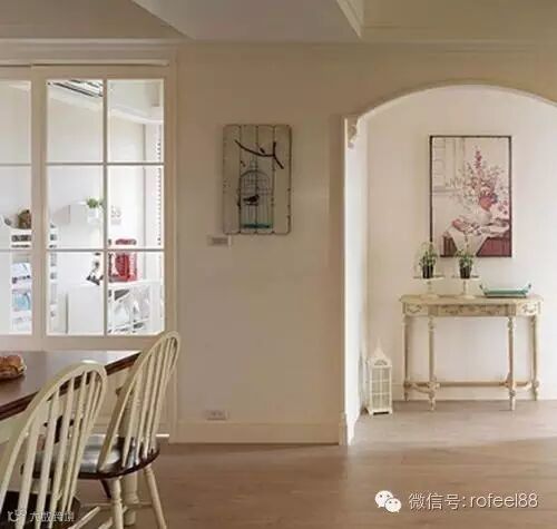 艺术画作与美式边桌静置端景墙前,透过门拱线条框筑出一幅立体画作,进而拉伸玄关空间意象。