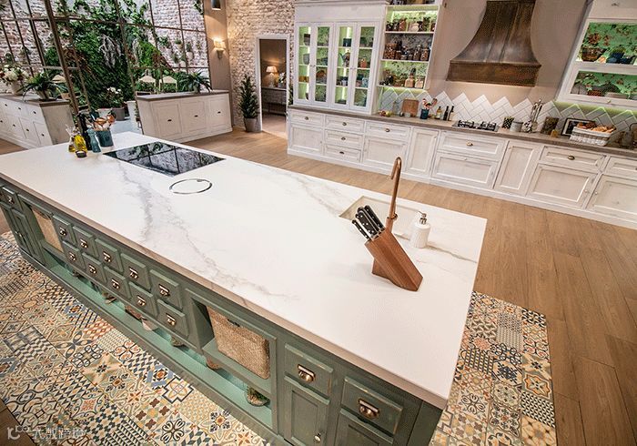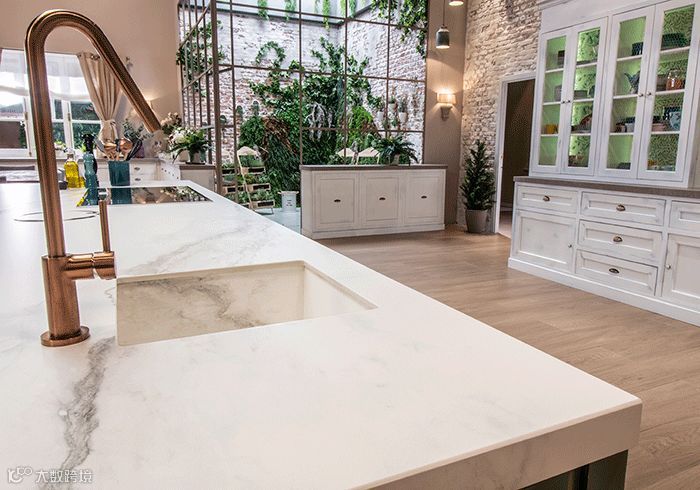 在长度超过三米的中央岛台上,厨师将在Larsen系列上准备食谱,纯白色背景,并以灰色调的优雅条纹设计。在这个岛台上,水槽和废纸篓都使用相同的岩板材料进行加工,这是使用Borcellana材料可以实现的一体化加工。