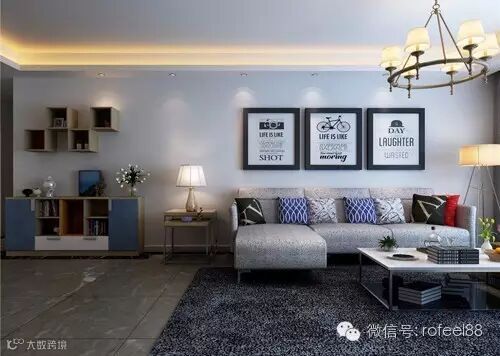 沙发一侧放置储物柜和吊柜,蓝色门板和沙发抱枕颜色相呼应,这样的设计对于较大的户型来说再合适不过,既不显得客厅空荡,又能增加客厅收纳。收纳柜台面放置茶水、点心,取用方便,非常实用。