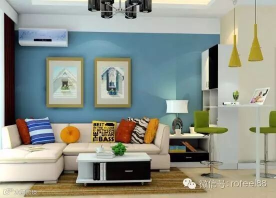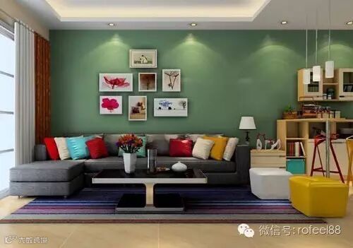 整面墙选择的是绿色的墙漆,整个空间看上去大气而时尚,带有沉稳的色彩。利用简单的吧台设计可以很好地区分客厅和餐厅的区域,而且非常自然,时尚而又创意的柜体和转角沙发的结合设计让人感到非常舒适,可以坐着聊天。
