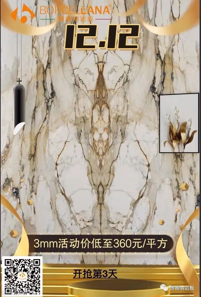 博賽纳岩板全国首个“进口岩板双12” 狂购节,3mm进口岩板360元/平方,开抢第3天!