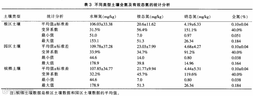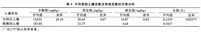 不同类型槟榔土壤全氮及有效态氮的统计分析见表3,其方差分析见表4。