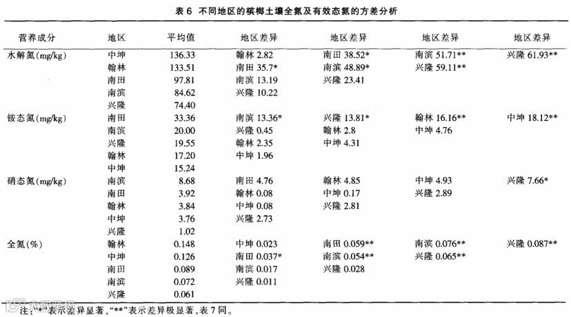 不同地区槟榔土壤全氮及有效态氮的方差分析见表6。由表6可知,槟榔土壤氮素总量及有效态氮地区间差异十分显著。