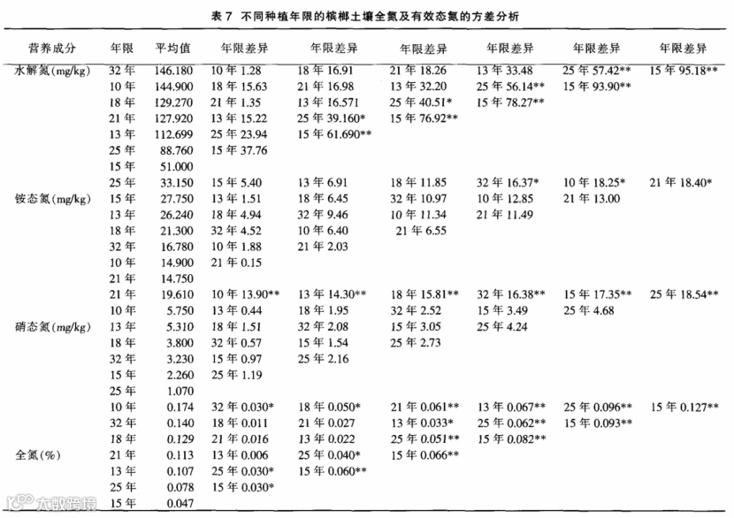 不同种植年限槟榔土壤全氮及有效态氮的方差分析见表7。由表7可知,