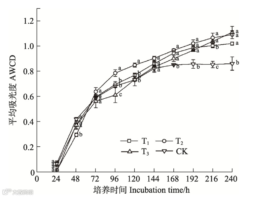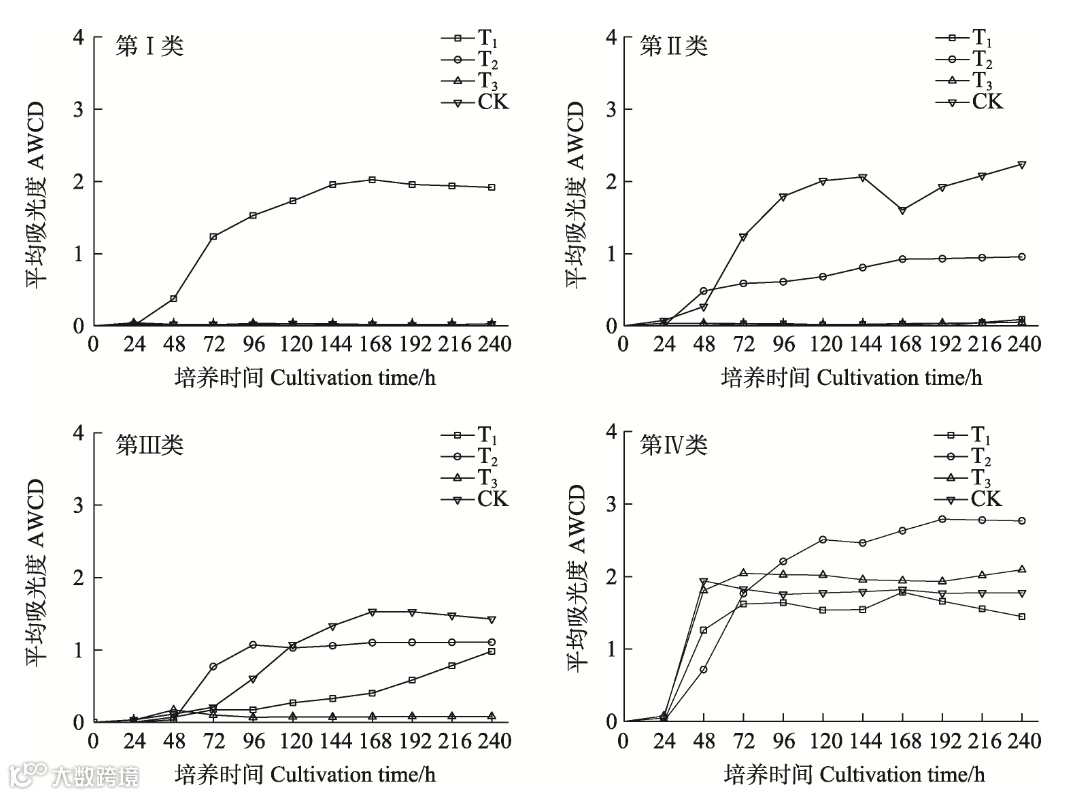 结果表明,添加后0~24h阶段,属于培育增殖初期,该阶段AWCD变化不明显;24~120h阶段,AWCD增加速率最快;在120~192h阶段,AWCD增加速率逐渐趋缓,且在192h后趋于稳定。