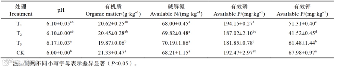 有机质含量则呈显著下降的趋势,与CK相比,T1、T2和T3处理的有机质含量分别减少0.71、0.88、1.46g/kg,表明添加特异组分有促进土壤有机质分解的趋势。不同处理的土壤碱解氮含量无显著差异,而土壤有效磷、有效钾含量呈下降趋势,有效钾尤为明显。
