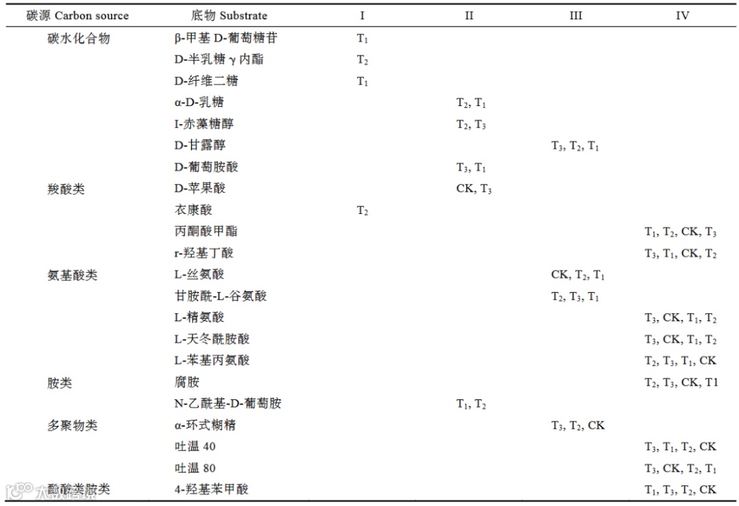 第IV类则能被4种添加处理土壤微生物利用,包括L-精氨酸等9种底物,涉及氨基酸类、羧酸类、多聚物类、酚酸类和胺类碳源,涉及T1、T2、T3和CK,其利用底物的数量均为4种。求和可知,T1、T2、T3和CK能够利用底物数量分别为17种、18种、15种和12种。