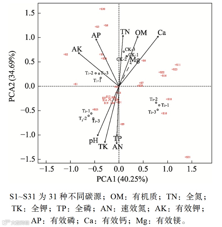 主成分分析(PCA)直观地反映了不同添加处理、根际土壤理化性质与31种不同碳源利用微生物之间的关系。如图3所示,第1主成分和第2主成分分别解释了数据中总变异的40.25%和34.69%,二者共同解释了全部方差的74.94%。