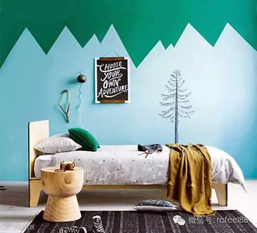 该墙面同样采用了两种涂料颜色,并且将接缝处设计成火山状的图案,可爱劲实足。