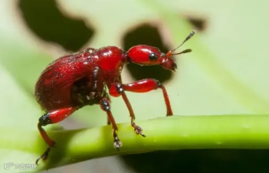 该虫属鞘翅目卷叶象鼻虫科。体长雄虫13~16mm,雌虫9~11mm。体色为单纯的红棕色,各脚腿节末端和胫节前端黑色;