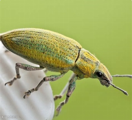 该虫属于鞘翅目象甲科。体长15~18mm,体黑色,表面密被闪光的粉绿色鳞毛,少数灰色至灰黄色,表面常附有橙黄色粉末而呈黄绿色,有些个体密被灰色或褐色鳞片。