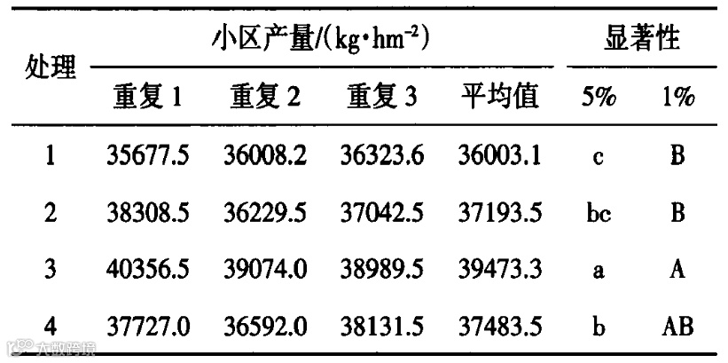 根据方差分析结果,各处理间的产量差异显著。处理3极显著高于处理2和处理1,显著高于处理4;处理4显著高于处理1;处理2和处理1间差异不显著。