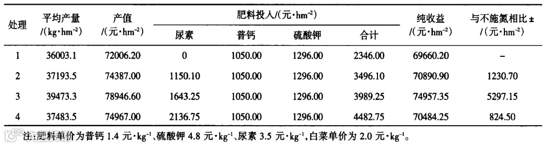 白菜不施用氮肥或氮肥施用过量,均不同幅度的导致白菜减产。这说明,只有合理的氮肥用量,白菜才能获得较高的产量。