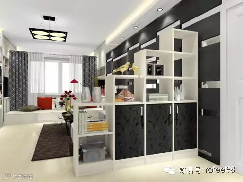 进门处的隔断柜做成阶梯的形式,高低错落,采用下实上虚的柜体,格子内可放置常用的物品,方便取放的需求,也可放置精致的饰品以此来点缀空间。下面可放用的少或比较杂乱的物品,让空间更整洁与干净。黑与白的经典搭配,令家居时尚更摩登。
