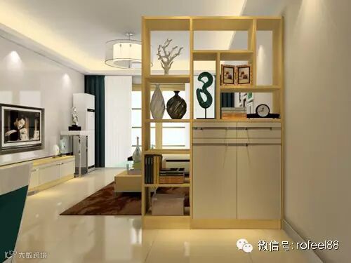 这套户型装修设计中,客厅与玄关的隔断方式采用了类似博古架的储物柜。客厅隔断柜上面博古架设计可以摆放主人各种不同的装饰工艺或者古玩收藏。客厅隔断柜下面的双门储物柜可以容纳家里大小物件的存放。非常的实用且具有艺术气息。