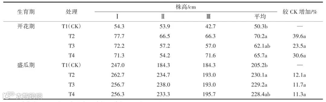 由表1可知,施用聚谷氨酸肥料增效剂的处理株高均有所增加,与CK相比,开花期株高增加了11.8~19.9 cm,增幅16.9%~39.5%,盛瓜期株高增加23.2~24.9 cm,增幅11.3%~12.1%。