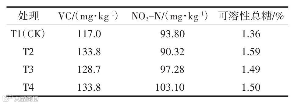 由表7可知,施用聚谷氨酸肥料增效剂能改善黄瓜果实品质,明显提高黄瓜的VC含量和可溶性总糖含量。与CK处理相比,T2、T3、T4处理黄瓜果实VC含量分别提高14.36%、10%、14.36%,可溶性总糖含量分别提高16.91%、9.56%、10.29%。