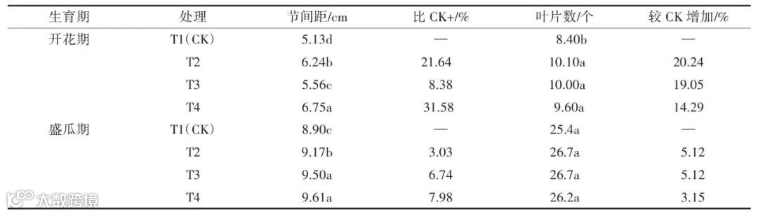 由表3可知,施用聚谷氨酸肥料增效剂的处理,不同生育期节间距显著高于CK。开花期,T2、T3、T4处理分别比CK提高了21.64%、8.38%、31.58%;盛瓜期T2、T3、T4处理分别比CK提高了3.03%、6.74%、7.98%。开花期和盛瓜期,T4处理节间距数值最大。