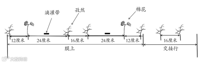 棉花株行距配置7.5厘米×(88+64)厘米,667m2播种1.1千克,棉花667m2理论株数11701株,播深2.5厘米。孜然株行距配置11厘米×(36+16+36+24+16+24)厘米,孜然667m2理论穴数23925穴,每穴下种8~10粒,667m2播种1.0千克,播深1.5~2.0厘米。