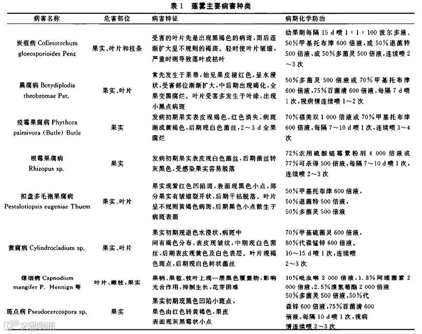 (1)几种常见病害:主要病害为炭疽病、果腐病和斑点病等。其病害特征及防治方法见表1。