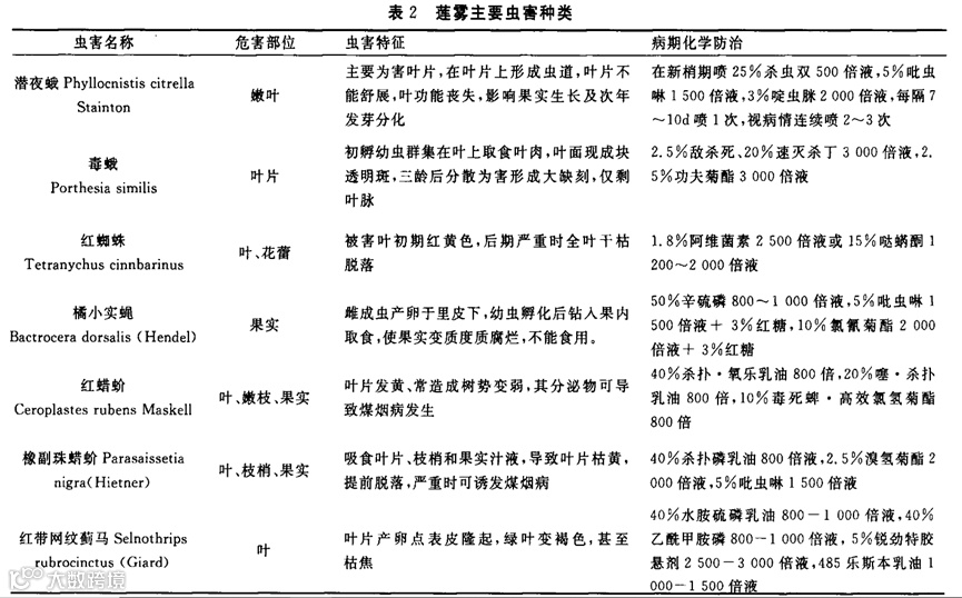 (2)几种常见虫害:莲雾生长快,特别是新梢抽发、嫩叶极易受虫害为害。其主要虫害特征及防治方法见表2。