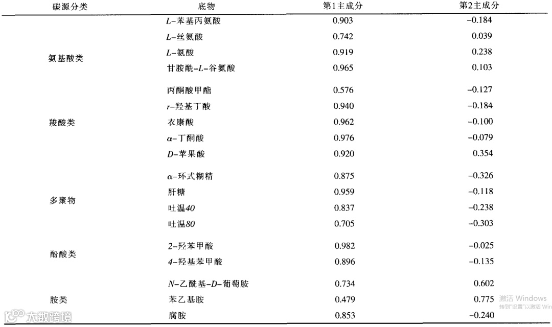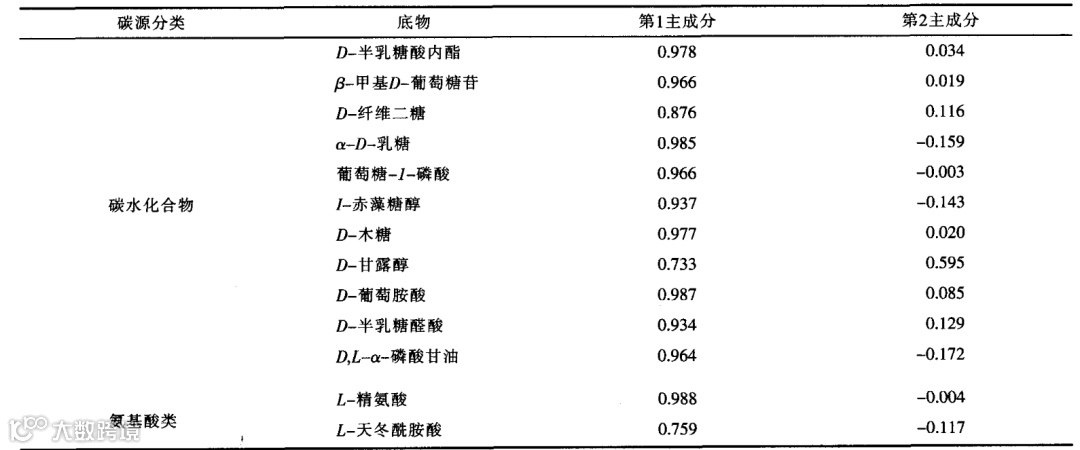 表3 EC0板上31种碳源在第1、2主成分上的载荷值