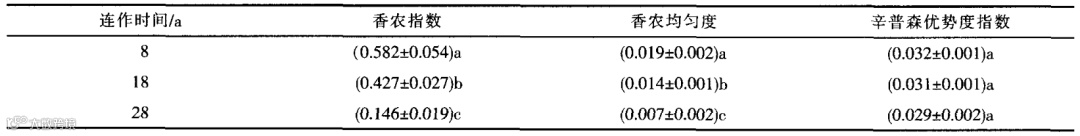 从图2可知,不同种植年限土壤微生物对不同碳源的利用程度差异较大,说明随着连作时间增加,土壤微生物群落结构发生了变化。其中,利用多聚物类和酚酸类碳源的微生物最先受到影响,从8a到18a这一阶段2类微生物有较大程度降低,而此后下降程度不大;而碳水化合物类、氨基酸类、羧酸类和胺类等碳源利用微生物则在18a后受连作影响较大,因而表现为28a明显下降。
