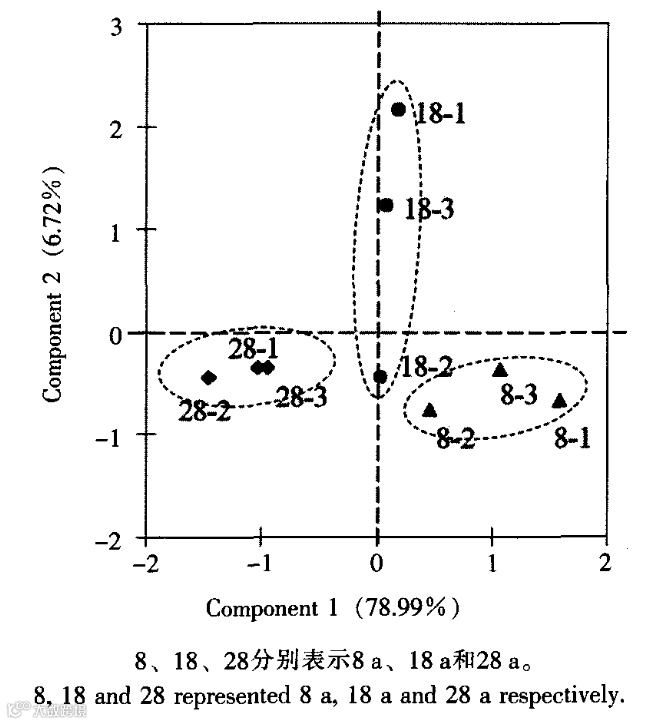如图3所示,2个主成分因子累计方差贡献率达到85.71%,说明2个主成分因子可以很好地解释不同种植年限土壤之间的绝大多数差异。其中第1主成分(PC1)的方差贡献率为78.99%,第2主成分(PC2)的方差贡献率为6.72%。在PC1轴上,8a、18a和28a分别分布于轴的正值区、零点区和负值区;在PC2轴上,18a主要分布于正值区,而8a和28a分布在负值区。